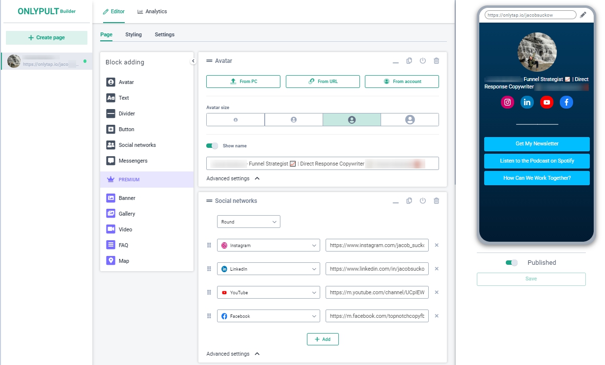 Onlypult Builder allows you to create micro landing pages and multiple links. Use it to drive traffic from your social networks. You can easily add links to your website, social networks, portfolio, or other website sections.