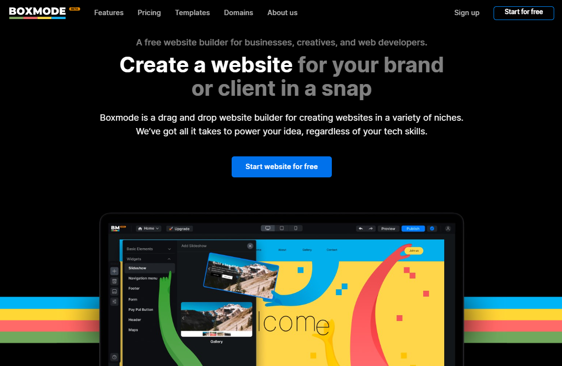 Boxmode is an all-in-one website builder that provides some of the most convenient tools to make a simple website with everything you need. It’s a targeted solution designed to eliminate the pains of users. The team behind the builder focuses on the most important features to satisfy every client. Boxmode offers customizable widgets, portfolio and online store features, outstanding niche templates, a simple code editor, and much more.