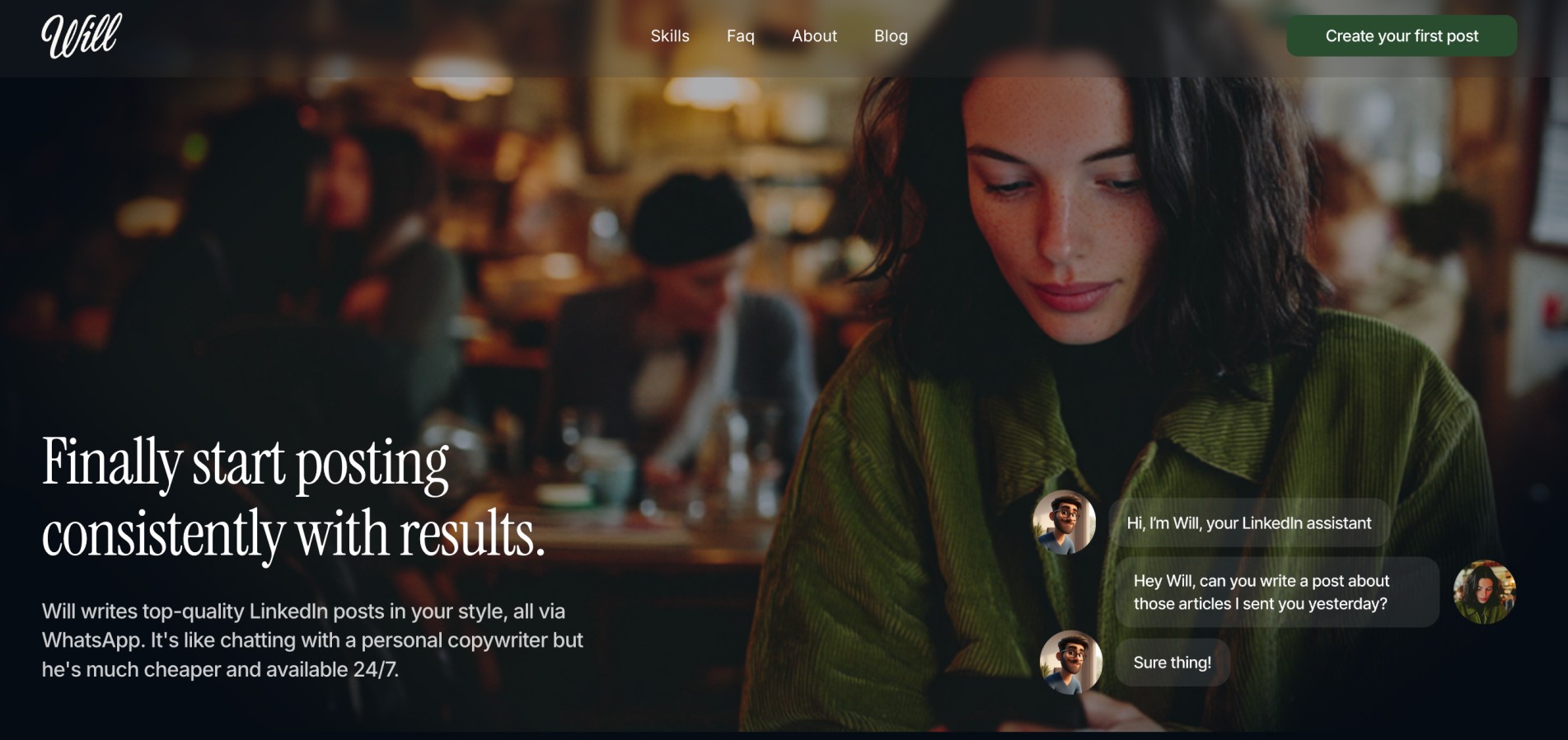 Will is the AI sidekick every thought leader didn’t know they needed. Developed by Willow, a social media management platform, Will has access to years of data and experience to help you turn everyday insights into polished LinkedIn posts, all through the simplicity of WhatsApp.